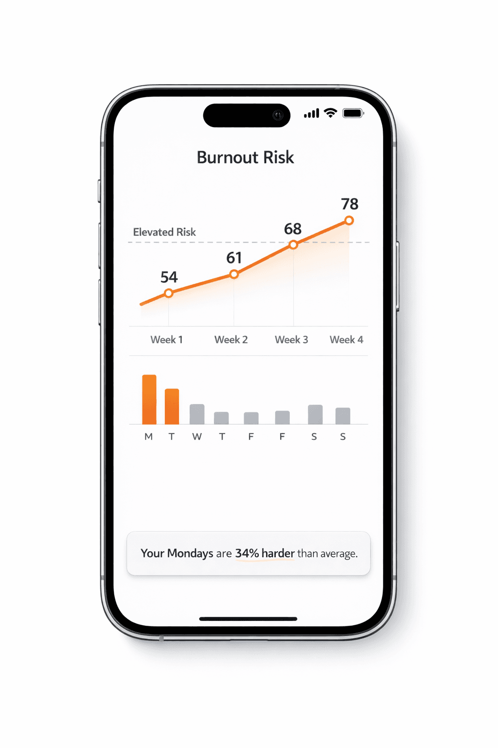 Which days are hardest? When do you recover – and when don't you? Burnout Shield shows you the data so you can make changes before your body forces them on you.